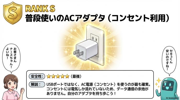 A:ホテルなどの壁にある「コンセントと一体化したUSBポート」も、構造上は裏で何かに繋がっている可能性を完全には否定できません。基本的には以下の順で安全度が高いと考えてください。