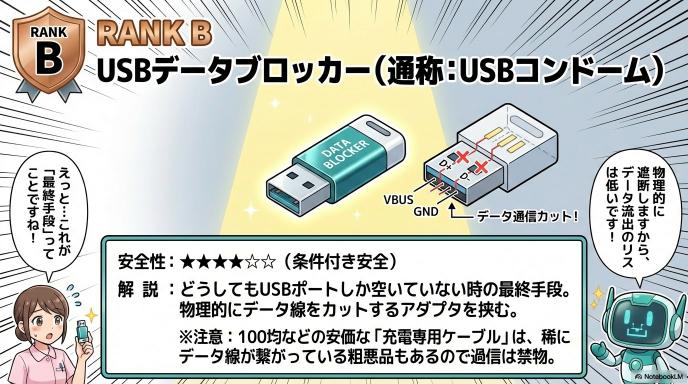 - どうしてもUSBポートを使うなら「データブロッカー」を挟む