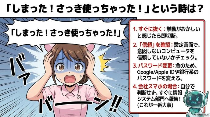 まず、接続した際に「このデバイスを信頼しますか?」といったポップアップが出て、それに「はい」と答えていないか思い出してください。もし許可してしまった場合は、リスクが高まるため以下の対策を急ぎましょう。