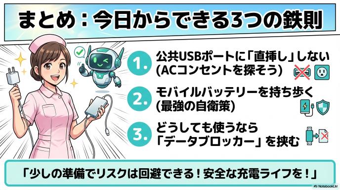 公共USB充電の危険性は、「幽霊」のように見えないものではなく、「仕組み」として理解できるリスクです。怖がりすぎる必要はありませんが、以下の3つのルールを頭の片隅に置いておくだけで、あなたのスマホと情報はぐっと安全になります。