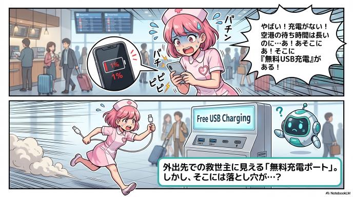 外出先でスマートフォンのバッテリーが切れそうなとき、空港やカフェ、駅の待合室にある「無料のUSB充電ポート」はまさに救世主に見えます。