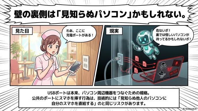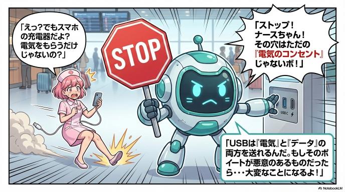 USBという規格は、便利な反面「電気」だけでなく「データ」も一本のケーブルで扱える仕組みになっています。もし充電口や備え付けのケーブルに悪意ある細工がされていた場合、あなたのスマホから情報が抜き取られたり、ウイルスに感染したりする可能性を完全には否定できません。