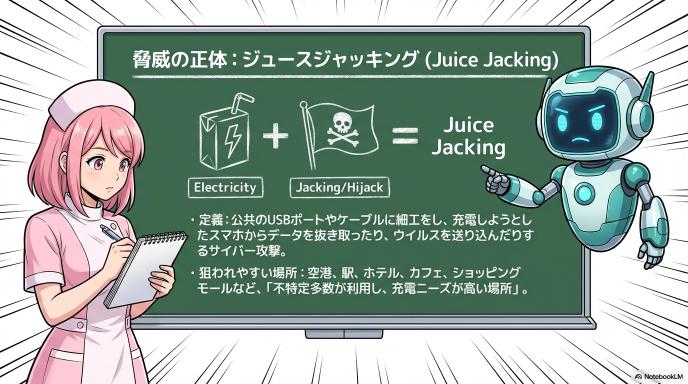 耳慣れない言葉かもしれませんが、セキュリティの世界では以前から警戒されている手口です。「充電(Juice)」と「乗っ取り(Jacking)」を掛け合わせたこの言葉が何を意味するのか、基本を解説します。