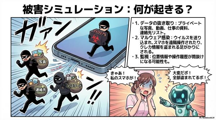 特定の条件がそろうと、端末情報の取得や、データアクセスの範囲が広がる可能性があります。また、OSのバージョンが古かったり脆弱性があったりする場合は、悪質なアプリ(マルウェア)を送り込まれるリスクもゼロではありません。