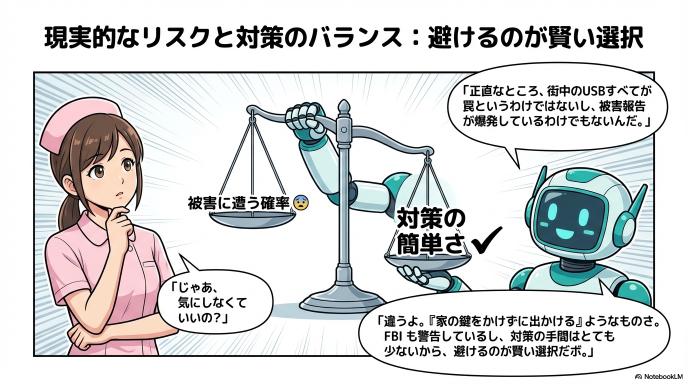 ここまで怖い話をしましたが、重要なのはバランスです。Ars Technicaなどの報道によると、「実際に公共USBで感染した」と確定された一般被害の報告はまだ多くありません。「挿したら即終わり」とパニックになる必要はありませんが、「家の鍵をかけずに外出する」ような不用心さは避けるべきでしょう。