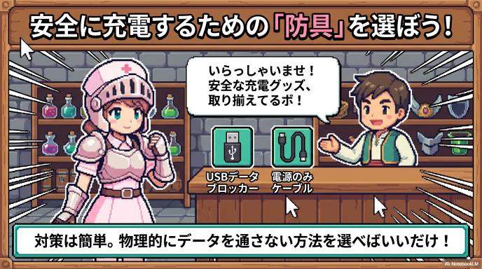 どうしてもUSBポートしか空いていない場合に備えて、「データ通信機能を物理的にカットしたアイテム」を持っておくのも有効です。